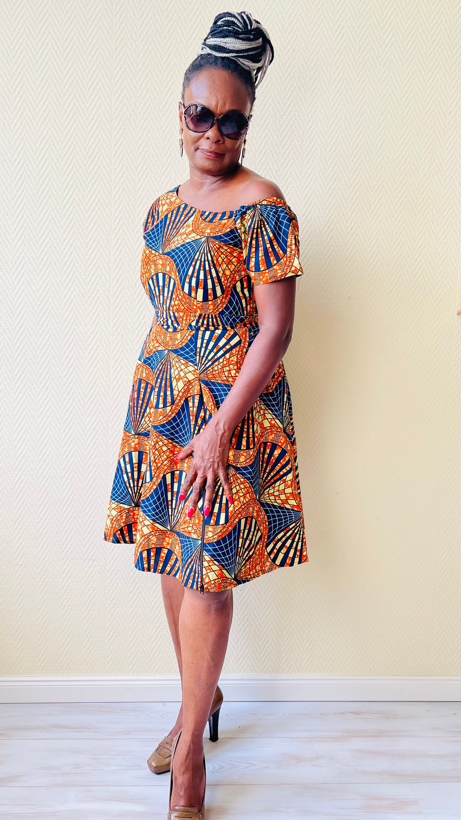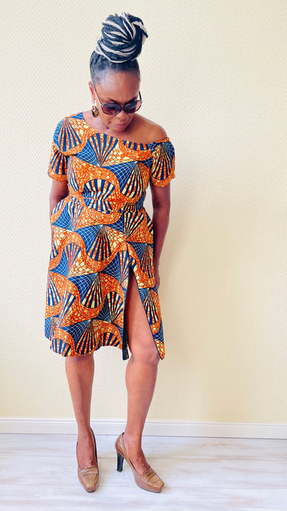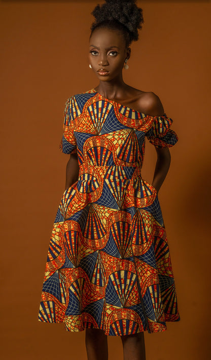 One-on shoulder and one-off shoulder sleeves dress with pockets. Bold and colorful prints that make you stand out wherever you go. This dress gives you that perfect effortless look and comes with a zipper slit that shows you off beautifully. Pair with heels for a perfect date night or party, in fact, this dress is designed for all occasions, you choose where and when to wear.